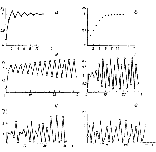 Типы динамики численности в модели популяции с неперекрывающимися поколениями при разных значениях собственной скорости роста. а.- Монотонный рост; б.- Затухающие колебания; в.- двухточечный цикл; г.- четырехточечный цикл; д, е- квазистохастическое поведение[22].