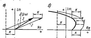 Очевидно, что годограф характеристического вектора САР можно получить из годографов отдельных звеньев аналогично, т.е. перемножением соответствующих векторов (эти операции называются перемножением годографов звеньев), а затем смещением вправо полученной кривой или перемещением влево начало координат (т.е. мнимой оси) на величину коэффициента усиления