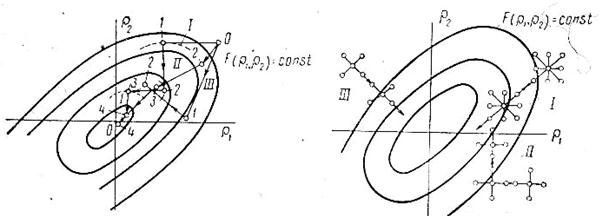 На рис.5.51, а ломанная I показывает применение рассматриваемого метода для двухмерного метода двухмерного процесса. На плоскости ρ1, ρ2 нанесены кривые равных значений функции качества F(ρ1, ρ2) = const. Первый шаг изменения координаты ρ1 (при ρ2 = const) производится до точки касания горизонтали 0-1 к кривой F(ρ1, ρ2) = const: в этой точке