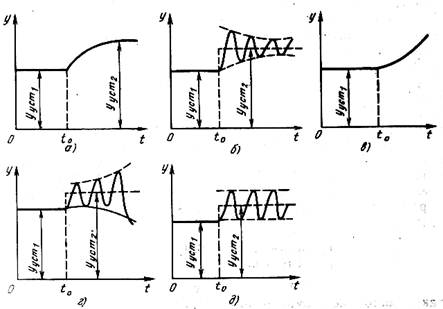 Рис.5.33. Виды переходных процессов: а, б – устойчивая САУ; в, г – неустойчивая САУ; д – консервативная САУ