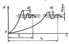 Устойчивость САУ является основным, но недостаточным условием, Поэтому не всякую устойчивую САУ можно применять для данного конкретного случая. Так, затухание переходного процесса (рис.5.34) может происходить при прочих равных условиях быстрее (Т1) или медленнее (Т2) с большими δ1 или меньшими δ2 отклонениями управляемого параметра от заданного значения.