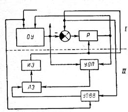 Рис.5.35. Элементная схема САУ: ОУ (ТОУ) – объект управления; Р – регулятор; УОП - устройство оценки параметров процесса; УОВВ – устройство оценки параметров внешних воздействий; ЛЭ – логический элемент; ИЭ – исполнительный элемент