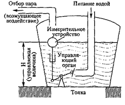 На рис.5.37 показан регулятор уровня воды в котле паровой машины. Измерительное устройство (поплавок), измеряющее управляемую величину (высоту уровня воды в котле), непосредственно перемещает управляющий орган (клапан питания котла водой). Котёл является управляемым объектом.
