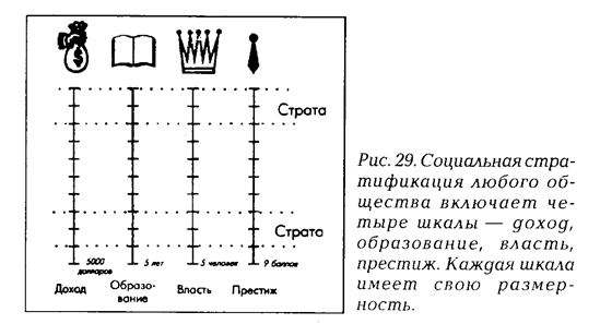 Каждая страта включает только тех людей, кто имеет приблизительно одинаковые доходы, власть, образование и престиж. Неравенство расстояний между статусами — основное свойство стратификации. У нее четыре измерительных линейки, или оси координат. Все они расположены вертикально и рядом друг с другом: