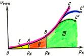 К параметрам режима бурения относятся: Осевая нагрузка на долото Рд, кН. оздается за счет нижней части бурильной колонны. В каждом сочетании б.к. и г.п. нагрузка индивидуальна. Частота вращения долота n, (об/мин). Рекомендуемая – 60-120 об/мин (10-235 об/мин) – это обеспечивает роторный способ бурения; при турбинном бурении – 700-800 об/мин Количество подаваемой насосом промывочной жидкости Q. показатели работы буровых долот: проходкаh, м - количество метров, пробуренных в горной породе от начала ее разрушения до рассматриваемого момента работы долота; проходка за рейс hр, м - количество пробуренных метров от первого спуска до первого подъема или от повторного спуска до повторного подъема; проходка на долотоhд,- общее число метров, пробуренных данным долотом; механическая скорость проходки Vм -количество метров, пробуренных за единицу времени Vм = hд / t,где: t время, hд - проходка; рейсовая скорость проходки Vp - скорость углубления скважины с учетом затрат времени на механическое бурение и спуско-подъемные операции и вспомогательные работы: Vр = hр /(tб + tспо + tв), где: hр - проходка за один рейс, м; tб-время механического бурения, ч.; tсповремя на спуско-подъемные операции, ч.; tв время на вспомогательные операции, ч. эксплуатационные затраты на 1 м. проходки Сэ, руб/м, определяются:Сэ = (Сд + (Сбу + Спж)(tб + tспо + tв)) / hд,где: Сд - оптовая цена долота, руб.; Сбу - стоимость одного часа работы буровой установки по затратам, зависящим от времени, руб/ч (с учетом типа буровой установки, района бурения, интервала глубин), Спж – затраты на приготовление пж, руб/ч 1.Нагрузка на долото: Зона I (участок ОА) – область поверхностного разрушения породы - контактное давление ниже предела усталости ГП. ЗонаII (участок АВ) – зона объемно-усталостного разрушения породы - контактное давление превышает предел усталости, но остается ниже уровня, соответствующего твердости ГП в забойных условиях рВ Зона III (участок ВС) – область эффективного объемного разрушения породы - контактное давление превосходит твердость ГП в забойных условиях. 2.Частота вращения долот Зависимость Vм от частоты вращения долота близка к линейной. Vм = d´n, где: d – проходка ствола скважины за один оборот инструмента; n – частота вращения, об/мин.