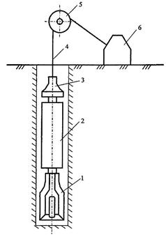 1 - долото; 2 - ударная штанга; 3 - канатный замок; 4 - канат; 5 - блок; 6 - буровой станок.