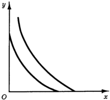 1. Кривые безразличия не достигают осей координат, а асимптотически приближаются к ним или к иным прямым, параллельным осям координат (рис. 6). Это означает, что сколь бы ни был велик объем потребления одного из товаров, он все же не может компенсировать полное отсутствие другого товара в наборе (иначе говоря, ни один из товаров не может быть полностью заменен другим, т. е. потребитель не может обойтись без какого-то количества каждого из товаров).