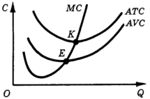 Возрастающая ветвь кривой предельных затрат (МС) пересекает кривые средних переменных (AVC) и средних общих (ATС) затрат в точках их минимумов Е и K.