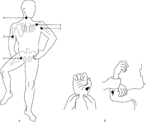 а — места пережатия артерий: I — бедренной, 2 — подмышечной, 3 — подключичной, 4 — сонной, 5 — плечевой; б — пальцевое пережатие
