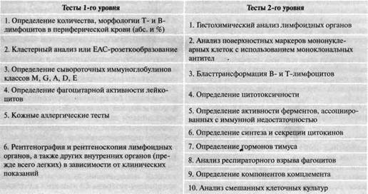 Таким образом, оценка иммунного статуса проводится на основании постановки большого числа лабораторных тестов, позволяющих оценить состояние как гуморального и клеточного звеньев иммунной системы, так и факторов неспецифической резистентности. Все тесты разделены на две группы: тесты 1-го и 2-го уровня. Тесты 1-го уровня могут быть выполнены в любой клинической иммунологической лаборатории первичного звена здравоохранения, они используются для первичного выявления лиц с явно выраженной иммунопатологией. Для более точной диагностики используются тесты 2-го уровня.
