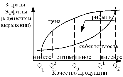 Рис. 3 Зависимость себестоимости и цены изделия от уровня его качественных характеристик.
