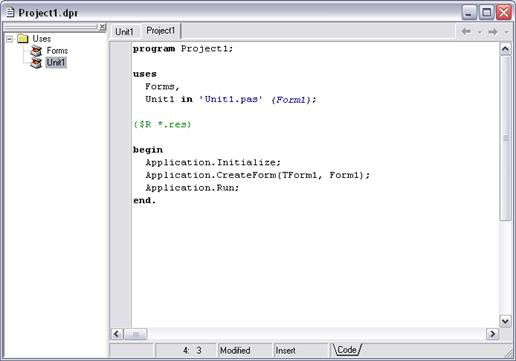Проект Delphi представляет собой набор программных единиц — модулей. Один из модулей — главный, содержит инструкции, с которых начинается выполнение программы. Главный модуль приложения полностью формируется Delphi.