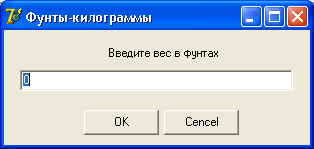 s:=InputBox('Фунты-килограммы','Введите вес в фунтах','0');