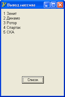 В качестве примера на рис. 5.1 приведено диалоговое окно приложения, которое демонстрирует инициализацию и процесс вывода значений элементов массива в поле метки. Программа выводит пронумерованный список футбольных команд. Следует обратить внимание, что для того чтобы список команд выглядел действительно как список, свойству Label1.AutoSize нужно присвоить значение False (присвойте свойству Label1.AutoSize значение True и посмотрите, как будет работать программа). Текст программы приведен в листинге 5.1.