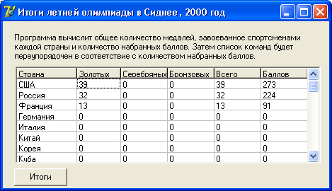 Сначала для каждой страны программа вычисляет общее количество медалей и соответствующее количество очков. Затем, используя метод простого выбора, программа выполняет сортировку таблицы по убыванию количества набранных очков. Во время сортировки для обмена строк таблицы используется строковый массив buf, индекс которого, как и индекс столбца таблицы, меняется от нуля до пяти (см. инструкцию объявления массива в тексте программы). Такой прием позволяет наиболее просто выполнить копирование замещаемой строки в буфер и замещение строки содержимым буфера.