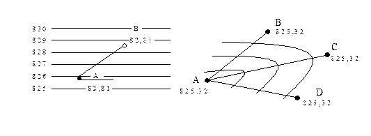 Мысалы, АВ сызығын һ=1 м интерполяциялау үшін паралель сызықтарға 825, 826, 827, 829 деп жазып алып, кальканы 45, а- суретінде көрсетілген планға саламыз. Планды калькамен беттестіргенде А және В нүктелері өз биіктеріне сәйкес параллель сызықтармен қиылысқан нүктелердің үстінен түйреп, із қалдырады, яғни А және В нүктелері арасынан 826, 827 және 828 горизонтальдары өтеді. Осы әдіспен басқа нүктелер аралары да интерполяцияланады және бірыңғай нүктелер сызықтармен қосылып, горизонтальдар сызылады (45, б- сурет).