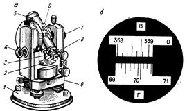 Микроскоп көрсетуінде (12б-сурет) тік дөңгелектің (жоғарыдан В әріпімен) және көлденең дөңгелектің (төменнен Г) суреттері көрініп тұр. Екі дөңгелектің де бөлу бағасы (өлшемі) 10¢. Есептеулерді қозғалмайтын (қимылсыз) индекс бойынша көзбен көру бөлудің оныншы үлесі бағасымен жүргізіледі. Суреттегі есептеу – тік дөңгелек бойынша 358°48¢ тең болса, көлденеңі - 70°05¢ ке тең.