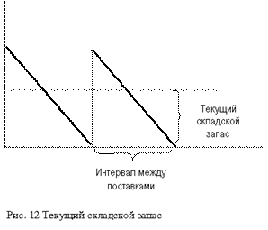 Текущим складским запасом материальных ценностей называют запас, обеспечивающий потребности производства на период между двумя очередными поступлениями их поставщиков (рис. 12).