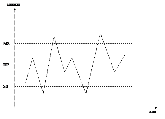 Логика модели: как только уровень запасов опускается до RP или ниже, делается очередной заказ. Если поставка осуществляется максимально эффективно, то уровень запасов может достичь MS.