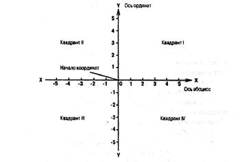 Пространственные ориентиры графика задаются в виде системы координатных сеток. Система координат необходима для размещения геометрических знаков в поле графика. Система координат - это совокупность элементов, определяющих положение точки на прямой или кривой линии, на плоскости или в пространстве. Существуют разные системы координат. Наиболее распространенной является система прямоугольных (декартовых) координат вследствие простоты ее построения, выразительности различных соотношений и зависимостей между изображаемыми величинами. Прямоугольная система координат образуется совокупностью двух пересекающихся перпендикулярных прямых, называемых осями координат (рис.1.1). Горизонтальная ось координат называется осью абсцисс, осью X, или осью ОХ, а вертикальная ось - осью ординат, осью У, или осью ОУ. Точка пересечения двух координатных осей (0) называется началом координат, а плоскость, в которой задана система координат, - координатной плоскостью.