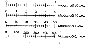 Масштабом равномерной шкалы называется длина отрезка (графический интервал), принятого за единицу и измеренного в каких-либо мерах. Чем меньше масштаб (рис.1.5), тем гуще располагаются на шкале точки, имеющие одно и то же значение. Построить шкалу - это значит заданный носитель шкалы разметить графическими интервалами с соответствующими числовыми обозначениями согласно условиям задачи.