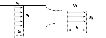 Основываясь на законе сохранения вещества, на предположении слоистости (неразрывности) течения жидкости имеем следующее утверждение: за одинаковый промежуток времени t через любое поперечное сечение канала проходит одинаковый объем жидкости V т.е. V1=S1l1; V2=S2l2; V2=V1