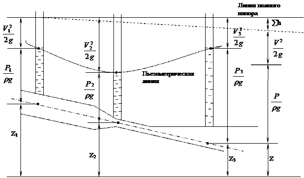 Для идеальной движущейся жидкости сумма трех напоров: геометрического, пьезометрического, и скоростного есть величина постоянная вдоль струйки.