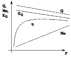 Основными характеристиками (параметрами) насосов являются: номинальные - рабочий объем, подача, давление, перепад давлений, мощность, а также частота вращения, КПД, коэф. подачи и т.д. Функциональная зависимость между определенными параметрами при неизменных остальных называют характеристикой гидромашины. Например для насосов при постоянной частоте вращения определяют следующие функциональные зависимости: Q=f(p), Nп=f(p), KQ=f(p),h=f(p)
