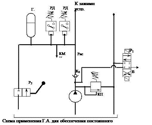 В определенных случаях необходимо рассчитать давление зарядки Г.А. исходя из условия 0,13Рmax£Рз£0,94Рmin Данная схема используется для обеспечения постоянного давления зажимного приспособления не зависит от давления в гидросистеме. При закрытом распределении Р1 рабочая жидкость поступает к зажимному приспособлению и на