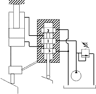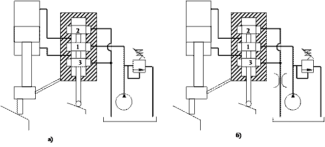 Иногда бывает удобней выполнять компоновку станка таким способом что бы приводить в движение цилиндры а не поршень. При этом для устранения пересечения трубопроводов удобно применять золотник с несколько измененным расположением рабочих кромок. В этом случае в корпусе нужно выполнить не три, а две мерных расточки, рис. (в).