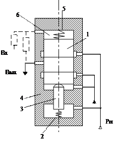 Этого недостатка лишены золотниковые гидравлические операционные усилители. В корпусе 4 размещен золотник 1 двухщелевого дросселирующего распределителя и плунжер толкатель 3. Пропорциональность между положением золотника 1 и приращением давления в камере управления 6 обеспечивается жесткостью пружин 2 и 5. Операционные усилители данного типа могут применяться при высоких значениях давления питания в системах с высокими требованиями к быстродействию.