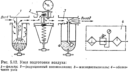 Показателем точности редукционных клапанов является изменение выходного давления при изменении входного давления (регулировочная характеристика) и расхода воздуха через пневмоклапан (расходная характеристика). Фильтры - влагоотделители, маслораспылители и пневмоклапаны редукционные объединяют в общий узел и называют узлом подготовки воздуха (рис. 5.12).