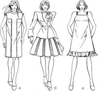 | Мал.2. Сучасні силуети а – прямий б – прилягаючий в – трапецевидний |