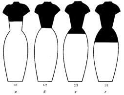 ![]() | Приклади пропорціональних відношень: а – завищена лінія талія (1/3); б – ліня ліфу розташована на лінії талії (1/2); в – лінія ліфу трохи занижена (2/3 – приближається до «золотого перетину»); г – ліф та спідниця однакові. |