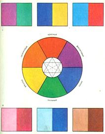 Родинно-контрастні кольорові сполучення - поєднання родинних кольорів і контрастних пар. Вони характеризуються яскравою кольоровою активністю слідомствие контрасту. Використання родинно-контрастних кольорів дає більш яскраву картину, так як теплі жовто-червоні родинні кольору доповнюють ¬ ся холодними червоно-синьо-фіолетовими.