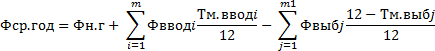 где Фн.г — стоимость основных фондов на начало года; Фввод i — стоимость вводимых в течение года основных фондов; Фвыб j — стоимость выбывающих в течение года основных фондов; Tм.ввод i ,Tм.выб j — число месяцев использования соответственно вновь вводимых и выбывающих основных фондов; m, m1 — число мероприятий соответственно по вводу и выбытию основных фондов в течение года, i =1,m; j = 1,m1.