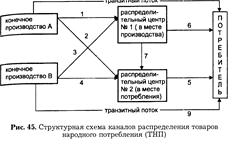 Рассмотрим каналы распределения, по которым товары из конечного производства через систему распределительных центров попадают в конечное потребление (рис. 45).