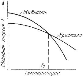 С изменением внешних условий свободная энергия изменяется по сложному закону различно для жидкого и кристаллического состояний. Характер изменения свободной энергии жидкого и твердого состояний с изменением температуры показан на рис. 3.1.