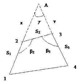 Рассмотрим теперь четырехугольник со всеми измеренными сторонами S1, S2, S3, S4 (рис. 6) и двумя противолежащими углами