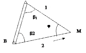 В точке В откладывается угол β2 и фиксируется точка 2. Наблюдатель передвигается в створе линии В2 до тех пор пока не станет в створе линии А1. В пересечении створов фиксируется точка М.