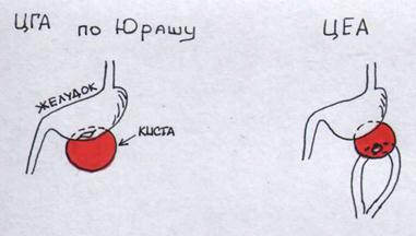 - цисто-гастро-анастомоз по Юрашу: панкреатический сок поступает из кисты в желудок.