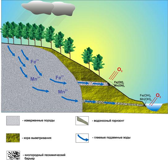 У оснований склонов, где происходит выклинивание таких вод,наблюдается концентрирование гидроксидов железа и марганца в виде марганцевых конкреций и пластов бурых железняков. Нередко глеевые воды, разгружаясь на дне мелких рек и озер, воды которых богаты кислородом, также осаждают в донных отложениях гидроксиды железа и марганца.