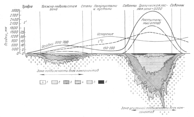 Прохождение выветривания до той или иной стадии зависит решающим образом от соотношения между количеством осадков, испаряемостью и среднегодовой температурой (рисунок 2.8).