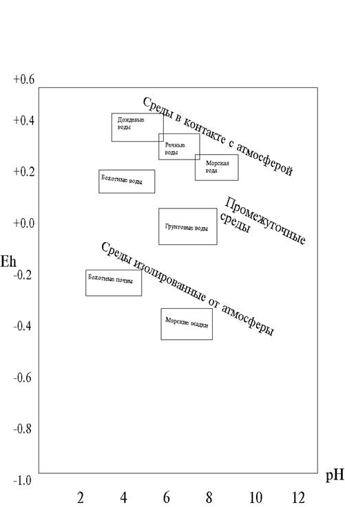 На рис. 2.1. видно, что окислительная обстановка может создаваться только в поверхностных водах при условии хорошей циркуляции и контакте с атмосферой. При прекращении контакта с атмосферой и при наличии органических остатков окислительная способность вод быстро исчезает, в них формируется восстановительная обстановка (болотные почвы, морские осадки). Разложение органических веществ под действием микроорганизмов приводит не только к появлению восстановительной обстановки, но и к увеличению кислотности среды за счет образования угольной кислоты Н2СО3 и сероводорода Н2S.