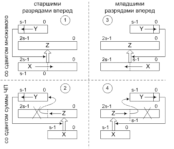 В соответствии со способом формирования суммы частичных произведений – (ЧП), возможны четыре варианта умножения. Они различаются тем, с каких разрядов множителя (Y) (младших или старших) начинается умножение, и что сдвигается (множимое или сумма ЧП).