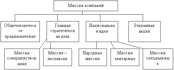 Миссия - обобщающая идея, на которую равняются все структурные составляющие организационной культуры. Миссия организации формулирует её главное предназначение в обществе, ту основную существенную причину, которая раскрывает смысл функционирования организации и в которой проявляются ее мировоззрение, философия и специфика. Это та определяющая идея, которая, с одной стороны, делает организацию частицей мирового хозяйства, имеющей свое важное предназначение и, следовательно, востребованной для этого хозяйства, а с другой – это индивидуальная причина, по которой существует именно эта, а не другая организация. Классификация миссий организации в зависимости от 1. Миссия «общечеловеческое предназначение»: служить человечеству, объединять людей, делать их жизнь лучше, удобнее, комфортнее, заботиться о процветании общества. 2. Миссия «главная стратегическая цель»: быть лучшими в мире, завоевать рынок, создать высшие ценности для наших клиентов и персонала, иметь лучшие результаты. 3. Миссия «национальная идея»: «народный автомобиль», в каждом доме – компьютер, каждой семье – отдельная квартира, каждому – сотовый телефон. 4. Миссия «рекламная акция»: мы выпускаем лучшие изделия, главное – забота о потребителе, наши клиенты уверены в будущем, этика бизнеса (РR-агентство) и т.п.