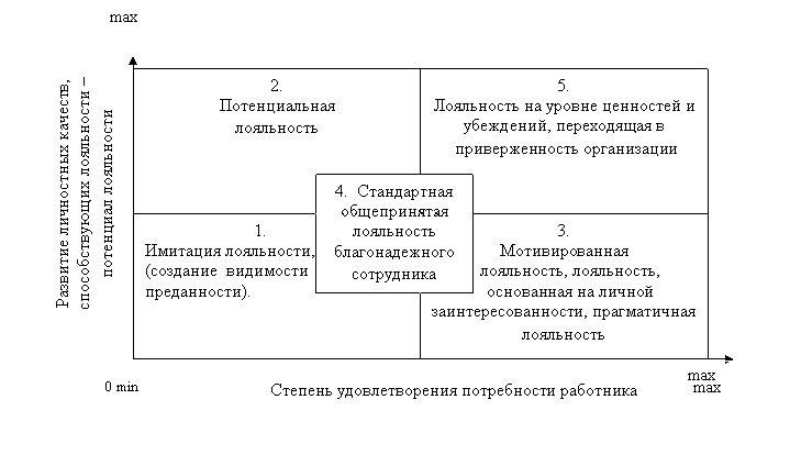 Пояснения к рисунку: Квадрант 1. Когда личностный потенциал лояльности мал, да и мотивация незначительна, у человека рождается т.н. имитационная лояльность. Квадрант 2. Если потенциал личностной лояльности велик и человек по своей природе склонен к эмоциональной привязанности, верности, благодарности, но эти его качества не подкрепляются и не мотивируются компанией, мы получаем потенциальную лояльность. Квадрант 3. Когда человек прагматичен, эмоционально беден, и ему вообще не свойственно проявлять привязанность и верность, сделать его лояльным может только высокая степень удовлетворения собственных потребностей в данной компании. Квадрант 4. При средней степени мотивированности и среднем потенциале лояльности компания получает общепринятую стандартную лояльность обычного благонадежного сотрудника, которая и присутствует в большинстве своем во всех организациях. Квадрант 5. Лояльностью этого уровня способны обладать лишь некоторые сотрудники компании, занимающие высокозамотивированные позиции и обладающие высоким потенциалом лояльности. Рис. 13. Модель развития лояльности персонала организации.