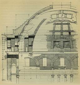 Как показали новейшие исследования, в куполе нет кирпичного каркаса, чем опровергаются указания и реконструкции Пиранези, Шуази, Дурма. Кессоны не облегчали, а скорее утяжеляли конструкцию; однако бетонная масса между кессонами могла со временем начать работать как своего рода внутренние ребра, в какой-то мере увеличивающие устойчивость системы (рис. 8.36).