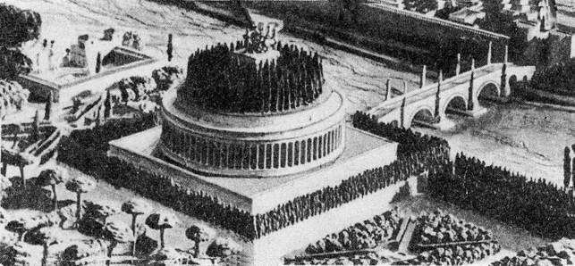 Даже в композиционном решении мавзолея Адриана (137-139 гг.) на правом берегу Тибра император попытался слить воедино принципы культового зодчества Запада и Востока – квадратный подиум «Царства Плутона» (высота 13 метров), мощный цилиндр «Земли» и конический «Небесный Свод» с бронзовой колесницей Гелиоса-Адриана на вершине: «Адриана похоронили у самой реки, близ Элиева моста. Там ему был построен памятник. Действительно, усыпальница Августа [см. № 1571] была переполнена, и в нее больше никого не клали…» (Кассий Дион, Римская история, LXIХ, 23) (рис. 8.45).
