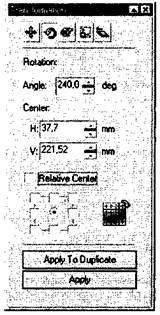 Угол поворота задается в счетчике Angle (Угол), а координаты точки, относительно которой происходит поворот, вводятся в счетчиках Н: и V:. Флажок Relative Center (Относительно центра) позволяет отсчитывать координаты центра вращения от центра объекта.